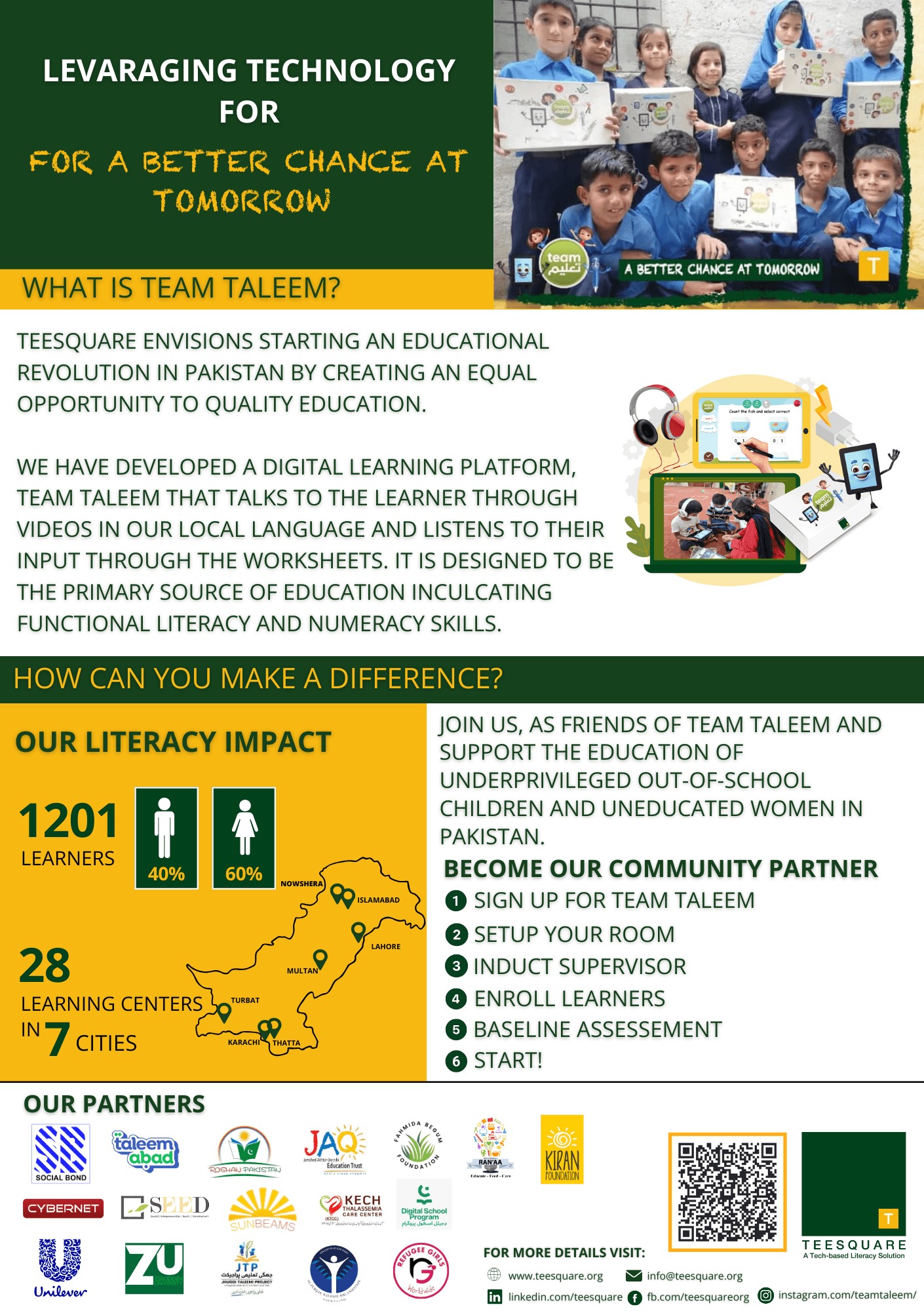 Commitment of only $300 will support 2 learners to complete KG to Class 2 of English, Urdu and Math using the accelerated learning program of Team Taleem.